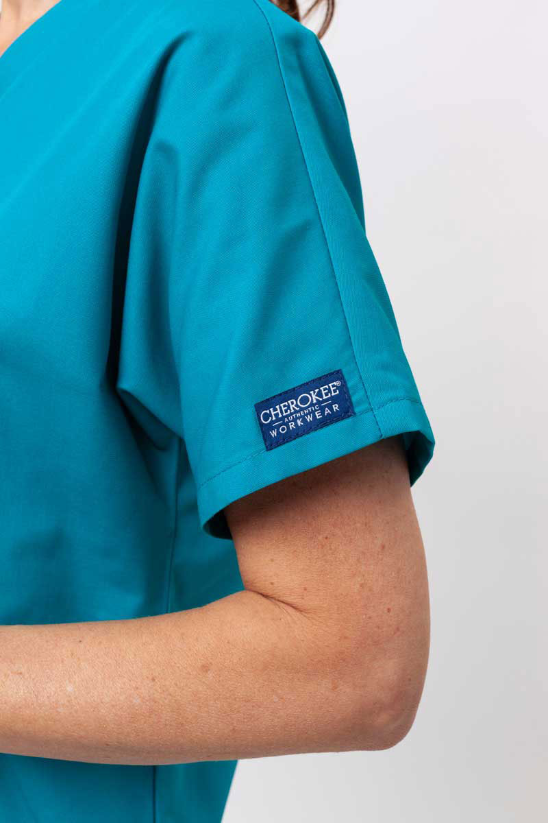 This practical, strong and affordable medical set from the American company Cherokee is the essence of top-notch scrubs. The top has a classic cut with a V-neck and stylish stitching. It will charm you with its simplicity and elegance. The trousers have slightly tapered legs and an elastic waistband to make them comfortable. This way, you’ll have full freedom of movement during your work. Both items are made of nice-to-touch and easy-to-wash fabric. It can be washed even at 70°C. The set is from the Originals collection. It’s a must have for your professional style!
