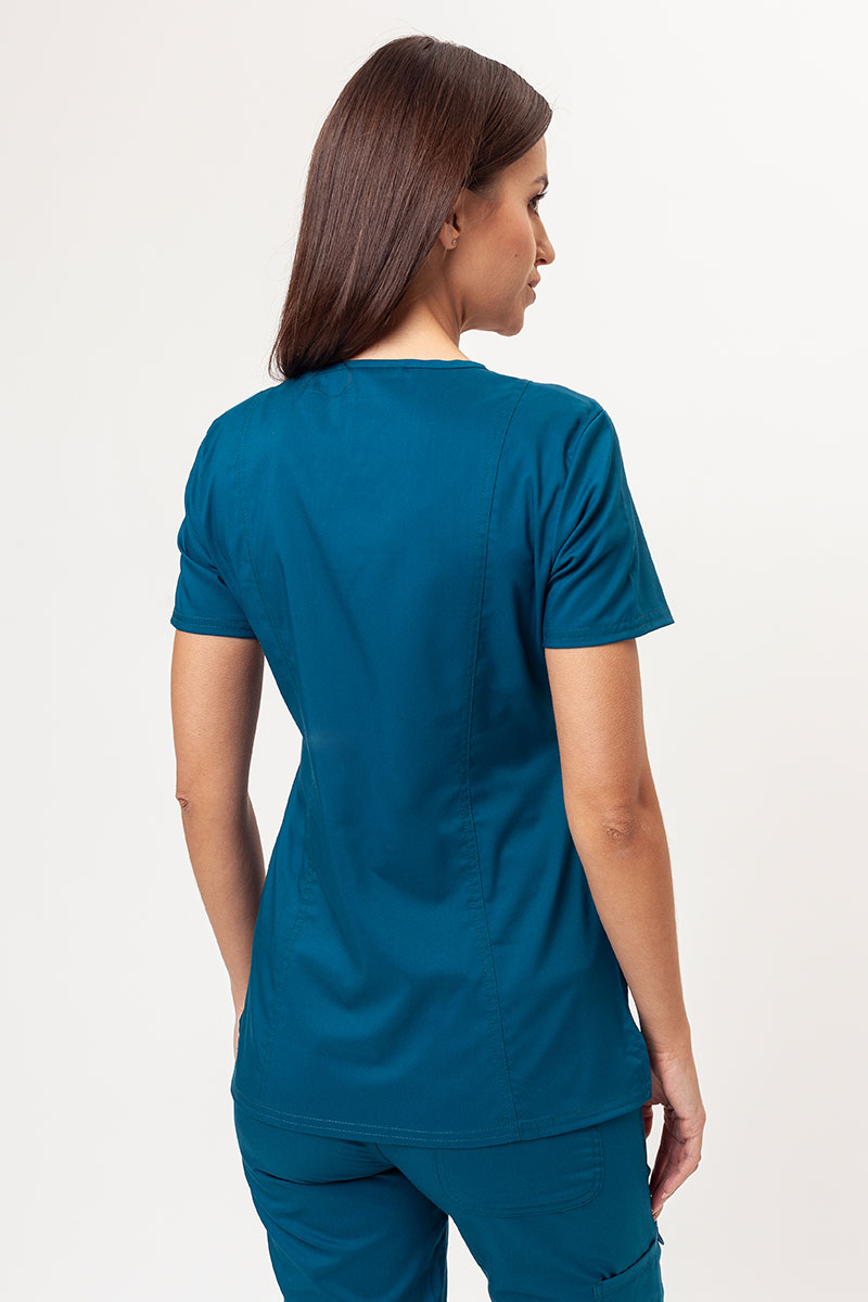 Who said that women’s scrubs cannot be attractive? This Cherokee scrub top proves that you can look stylish and feel comfortable at the same time. With a tailored fit, narrower at the chest and wider at the bottom, the top has princess seams that will accentuate your feminine shapes. The capacious pockets have neat and elegant stitching. The top is made of fabric that will help you move freely and work smoothly in any conditions.