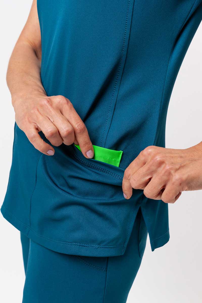 Sometimes at work, you need more than just comfort — you want an outfit that highlights your professionalism and keeps you energized all day. A V-neck sweatshirt with subtle stitching, paired with slightly flared pants featuring an adjustable waistband, creates a set that combines freedom of movement with feminine style. Made from stretchy, breathable fabric with moisture-wicking properties, it keeps you fresh and comfortable from the first to the last minute of your shift. Practical pockets in both the top and pants ensure that everything you need is always within reach. This set is more than a uniform — it’s your daily dose of confidence and ease.