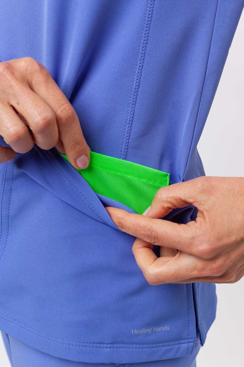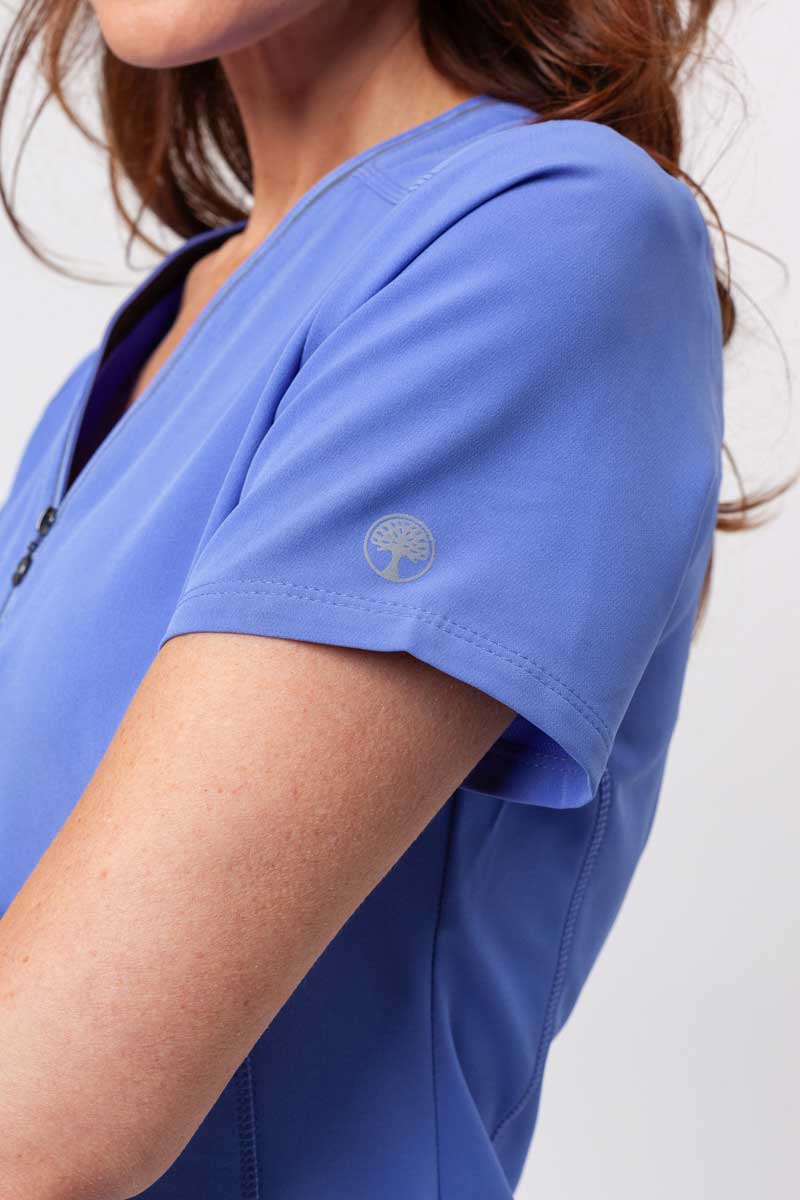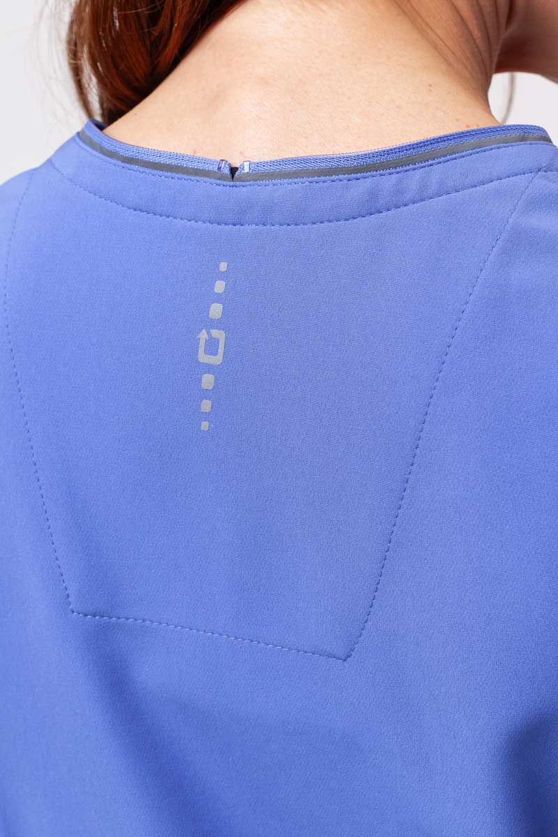 Reflective trims catch the light with every movement, while the fitted silhouettes of the top and trousers give the uniform a subtly sporty, modern feel. The zip neckline, shaping seams, and delicate details on the top enhance the figure with a refined twist, while the straight trousers with reflective trim on the pockets and two-tone drawstring create a cohesive, harmonious line. Five practical pockets hold everything you need for work, and the soft, four-way stretch fabric wicks moisture, retains color, and provides all-day comfort. This set combines comfort, functionality, and style - a uniform that truly stands out.