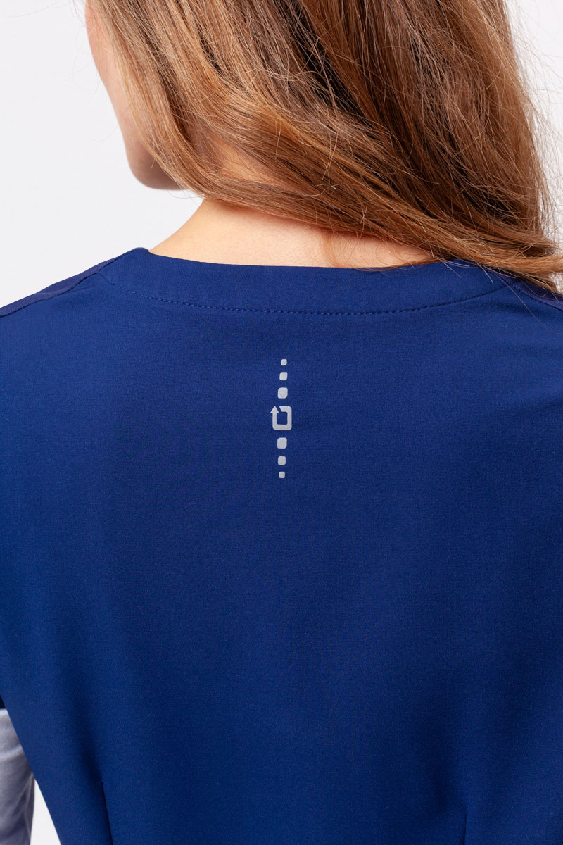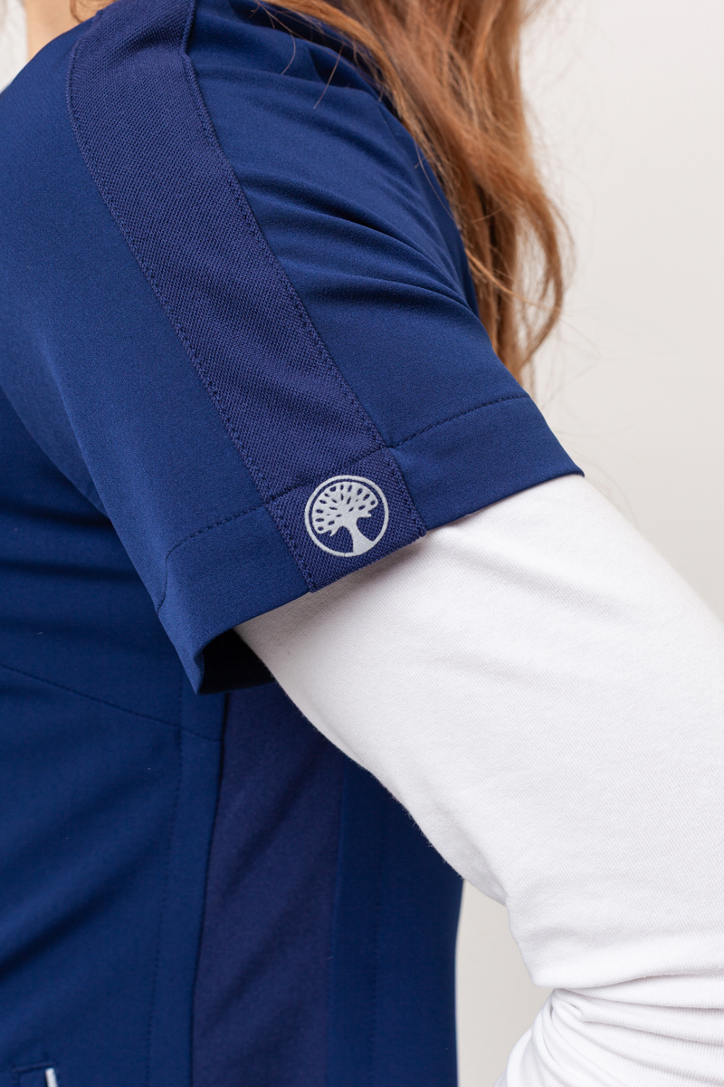 Modern with a retro twist - the Skyler top combines sporty ease with a feminine, refined style. Subtle trim on the side pockets and a discreet Healing Hands logo on the sleeve add character, while shaping seams at the back and side slits enhance the silhouette. The V-neckline and slightly tailored cut create an elegant look, and the rounded hem adds softness and lightness to the overall shape. Soft, four-way stretch fabric wicks moisture, retains color, and ensures all-day comfort. Skyler is a top that defines style on its own - perfect worn alone or paired with the fitted Nisha trousers.