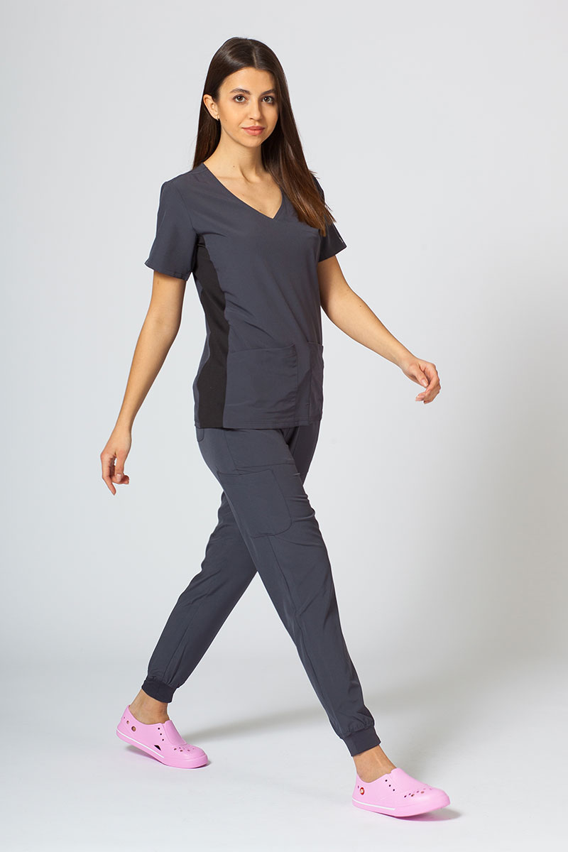 With its modern cut and sports style, the Maevn Matrix scrubs top is a great choice for anyone who wants to feel comfortable while retaining good style. The use of spandex and side vents make the top elastic, so it perfectly fits any figure. The handy pockets, including one with an organiser inside, are stylishly arranged. The contrasting colours and asymmetric neckline make for an attractive top.